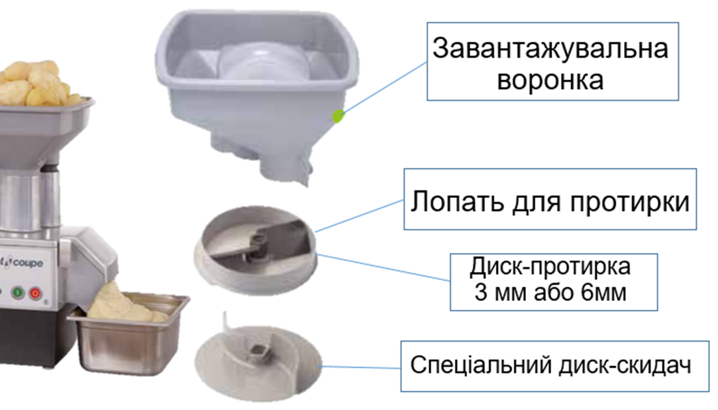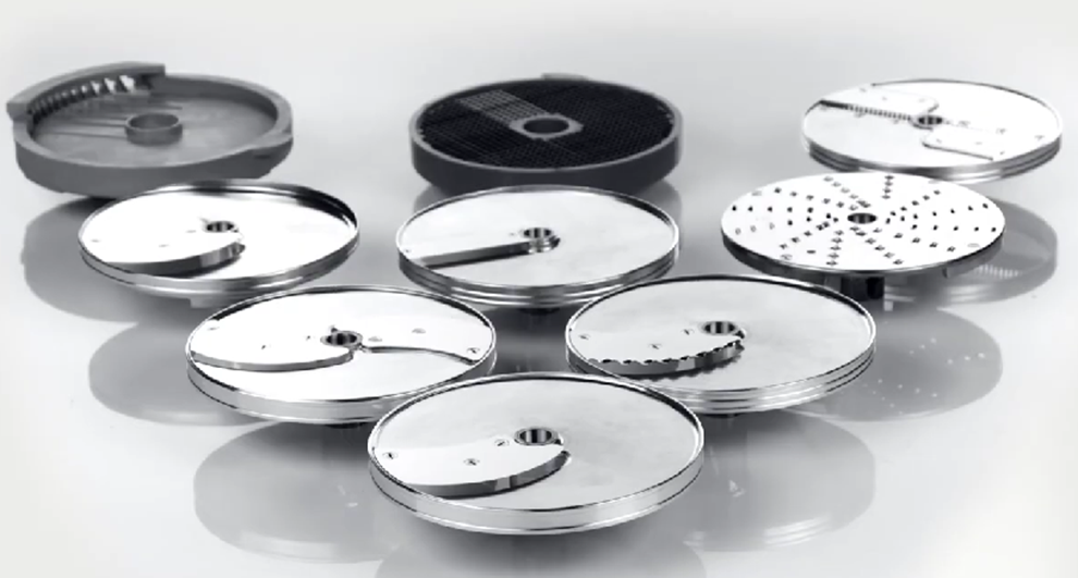 Повна колекція з більш ніж 50 дисків із високою точністю заточування лез для ідеальної якості нарізки. Пропонує різноманітні варіанти нарізки - подрібнення, натирання, нарізка хвилястими скибочками, жульєн, кубиками, брусочками фрі, а також приготування пюре.