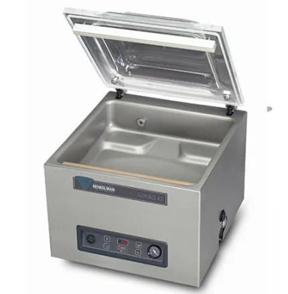 Удосконалена модель пакувальника вакуумного Henkelman серії Jumbo широко застосовується в супермаркетах, громадських харчуваннях. Призначений для продуктів харчування. Ідеально підходить для пакування сирів, м'яса, фруктів, овочів. Пакувальна машина сприяє безпечному збільшенню терміну придатності та якості продукту, відповідно збільшує товарообіг та асортимент. Корпус та вакуумна камера виготовлені з якісної нержавіючої сталі та оснащена прозорою кришкою для наглядного контролю за процесом упаковки. Також можна зменшити розмір камери спеціальними габаритними вставками. Сенсорна система управління пакувального апарату дозволяє контролювати весь процес пакування, а також переривати цикл роботи. Зварна планка пакувальника складає довжину 350 мм, а запаювальна струна 3,5 мм. в ширину. Також пакувальник дозволяє запаювати забруднені пакети жировим складом.