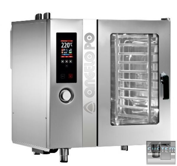 Пароконвектомат Angelo Po FX101E3R: Электрический нагрев. Реверсивное открытие двери - правосторонее. Вместимость - GN 1/1 х 10, противни 60х40 х 8. Условная производительность - 140 блюд. Топ модель - уровень 3.