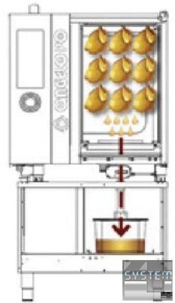 При приготовлении кур гриль выделяется очень большое количество жира и соков. В стандартных пароконвектоматах жир начинает перетекать из камеры печи на дно в связи с чем оно, как правило, сильно загрязняется. В пароконвектоматах FX STAR Chikenstar имеется возможность установки специальной автоматической системы сброса жира и соков во внешний съемный накопитель большого объема. Герметичность соединений между камерой и накопителем исключает выливание жиров в месте установки FX STAR. Вам гарантируется отличное качество приготовления и идеальные гигиенические условия в месте установки. Специальные аксессуары обеспечивают технологичность процесса очистки и перемещения готового продукта между цехами.