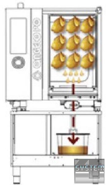 При приготовлении кур гриль выделяется очень большое количество жира и соков. В стандартных пароконвектоматах жир начинает перетекать из камеры печи на дно в связи с чем оно, как правило, сильно загрязняется. В пароконвектоматах FX STAR Chikenstar имеется возможность установки специальной автоматической системы сброса жира и соков во внешний съемный накопитель большого объема. Герметичность соединений между камерой и накопителем исключает выливание жиров в месте установки FX STAR. Вам гарантируется отличное качество приготовления и идеальные гигиенические условия в месте установки. Специальные аксессуары обеспечивают технологичность процесса очистки и перемещения готового продукта между цехами.