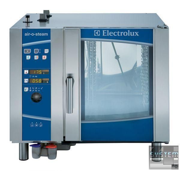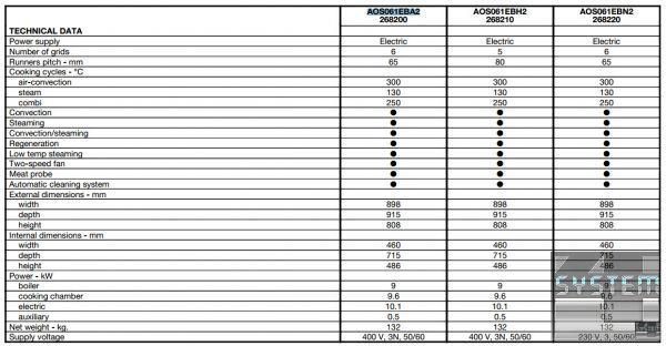 Пароконвектомат Electrolux AOS061EBA2 (артикул 268200) бойлерного типу на 6 GN1/1 гастроємностей, режими приготування: конвекція (до 300°C), на пару (до 130°C), комбінований (30-250°C, 0- цикл регенерації, Delta T, автоматична система миття Air-o-Clean, вентилятор подвійної дії, рівномірний розподіл гарячого повітря Air-o-Flow, електронне управління, швидке охолодження камери, ручне упорскування води, функція марміту (так само дозволяє готувати при низьких температурах ), однозонний пробник-зонд, автоматичне визначення відкладень солей у бойлері, подвійний склопакет дверей, термостат, підсвічування камери, нерж. сталь. Пароконвекційна піч Electrolux 268200 прямокутної форми з габаритними розмірами: 898мм (довжина), 915мм (глибина), 808мм (висота) та важить 132кг. Апарат живиться від трифазної мережі потужністю 10,1 кВт з напругою 400В і частотою 50 Гц.