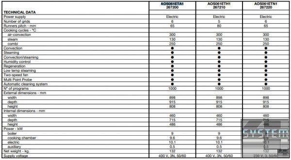 Пароконвектомат Electrolux AOS061ETA1 (артикул 267200) бойлерного типу на 6 GN1/1 гастроємностей, бойлерного типу, програмований, 3 способи приготування (автоматичний, через панель рецептів (1000шт. в 16 етапів), ручний). Повністю автоматичне приготування (задається тип продукту та спосіб його обробки, вага, об'єм та час приготування визначається пароконвектоматом), при ручному методі та створенні рецептів доступні такі режими приготування: конвекція (25-300°C), пара (100°C), низькотемпературна пар (25-99°C), перегріта пара (101-130°C), комбінована, Eco-Delta, приготування при низьких температурах LTC, безпосереднє відстеження та контроль вологості в камері Air-o-Clima, автоматична система миття Air-o -Clean, вентилятор подвійної дії, рівномірний розподіл гарячого повітря Air-o-Flow, сенсорна інтерактивна панель управління, швидке охолодження камери, ручне впорскування води, функція марміту, мультизонний пробник-зонд, вбудований витяжний душ, автоматичне визначення відкладень солей склопакет двері, термостат, підсвічування камери, USB-порт, нерж. сталь. Пароконвекційна піч Electrolux 267200 прямокутної форми з габаритними розмірами: 898мм (довжина), 915мм (глибина), 808мм (висота) та важить 132кг. Апарат живиться від трифазної мережі потужністю 10,1 кВт з напругою 400В і частотою 50 Гц.