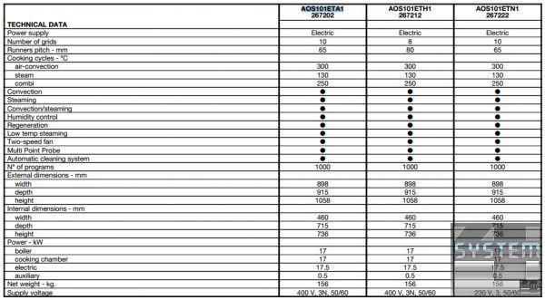 Пароконвектомат Electrolux AOS101ETA1 (артикул 267202) бойлерного типу на 10 GN1/1 гастроємностей, бойлерного типу, програмований, 3 способи приготування (автоматичний, через панель рецептів (1000шт. в 16 етапів), ручний). Повністю автоматичне приготування (задається тип продукту та спосіб його обробки, вага, об'єм та час приготування визначається пароконвектоматом), при ручному методі та створенні рецептів доступні такі режими приготування: конвекція (25-300°C), пар (100°C), низькотемпературний пар (25-99°C), перегріта пара (101-130°C), комбінована, Eco-Delta, приготування при низьких температурах LTC, безпосереднє відстеження та контроль вологості в камері Air-o-Clima, автоматична система миття Air-o -Clean, вентилятор подвійної дії, рівномірний розподіл гарячого повітря Air-o-Flow, сенсорна інтерактивна панель управління, швидке охолодження камери, ручне впорскування води, функція марміту, мультизонний пробник-зонд, вбудований витяжний душ, автоматичне визначення відкладень солей склопакет двері, термостат, підсвічування камери, USB-порт, нерж. сталь. Пароконвекційна піч Electrolux 267202 прямокутної форми з габаритними розмірами: 898мм (довжина), 915мм (глибина), 1058мм (висота) та важить 156кг. Апарат живиться від трифазної мережі потужністю 17,5 кВт з напругою 400В і частотою 50 Гц.