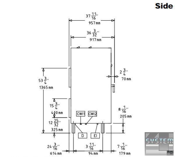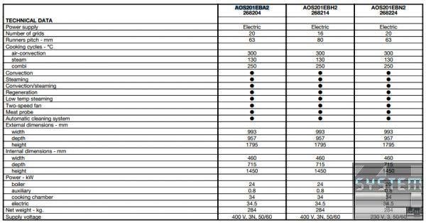 Пароконвектомат Electrolux AOS201EBA2 (артикул 268204) бойлерного типу на 20 GN1/1 гастроємностей, режими приготування: конвекція (до 300°C), на пару (до 130°C), комбінований (30-250°C, 0 цикл регенерації, Eco-Delta, автоматична система миття Air-o-Clean, вентилятор подвійної дії, рівномірний розподіл гарячого повітря Air-o-Flow, електронне управління, швидке охолодження камери, ручне упорскування води, функція марміту (так само дозволяє готувати при низьких температурах), однозонний пробник-зонд, автоматичне визначення відкладень солей у бойлері, подвійний склопакет дверей, термостат, підсвічування камери, в комплекті з візком, нерж. сталь. Пароконвекційна піч Electrolux 268204 прямокутної форми з габаритними розмірами: 993мм (довжина), 957мм (глибина), 1795мм (висота) та важить 284кг. Апарат живиться від трифазної мережі потужністю 34,5 кВт з напругою 400В і частотою 50 Гц.