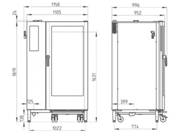 Розміри гастроємності: GN 2/1 (650x530 мм). Основне обладнання цієї пароконвектомата включає візок. Існує або система упорскування, або парогенератор котла. Джерелом тепла є електрика чи газ.