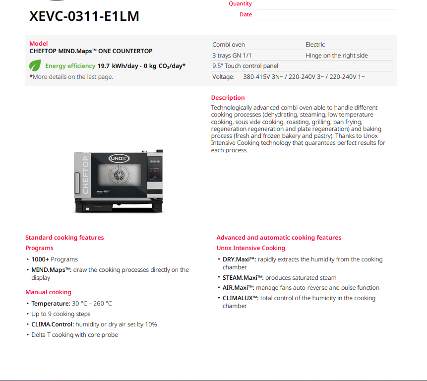 Пароконвекційна піч UNOX CHEFTOP MIND.Maps™ XEVC-0311-E1LM — це технологічний прорив у сфері професійного теплового обладнання, що втілює багаторічний досвід світового лідера галузі. Серія була створена спеціально для шеф-кухарів та рестораторів, які не готові до компромісів між творчою свободою та суворим контролем якості. Завдяки інтелектуальним системам управління, ця пічь гарантує абсолютну повторюваність результату: кожна страва буде ідеальною, незалежно від того, хто сьогодні стоїть на зміні.