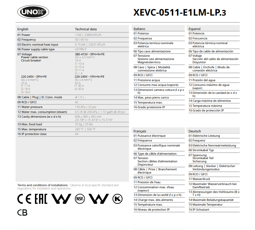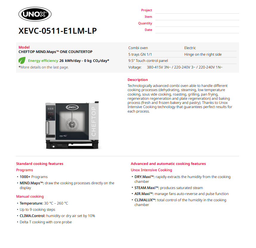 Пароконвектомат оснащений цифровою сенсорною панеллю ONE, задається програма на дисплеї, а обладнання здійснює автоматично всі процеси в камері, за допомогою вбудованого мікропроцесора, а по закінченні сповіщає сигналом.