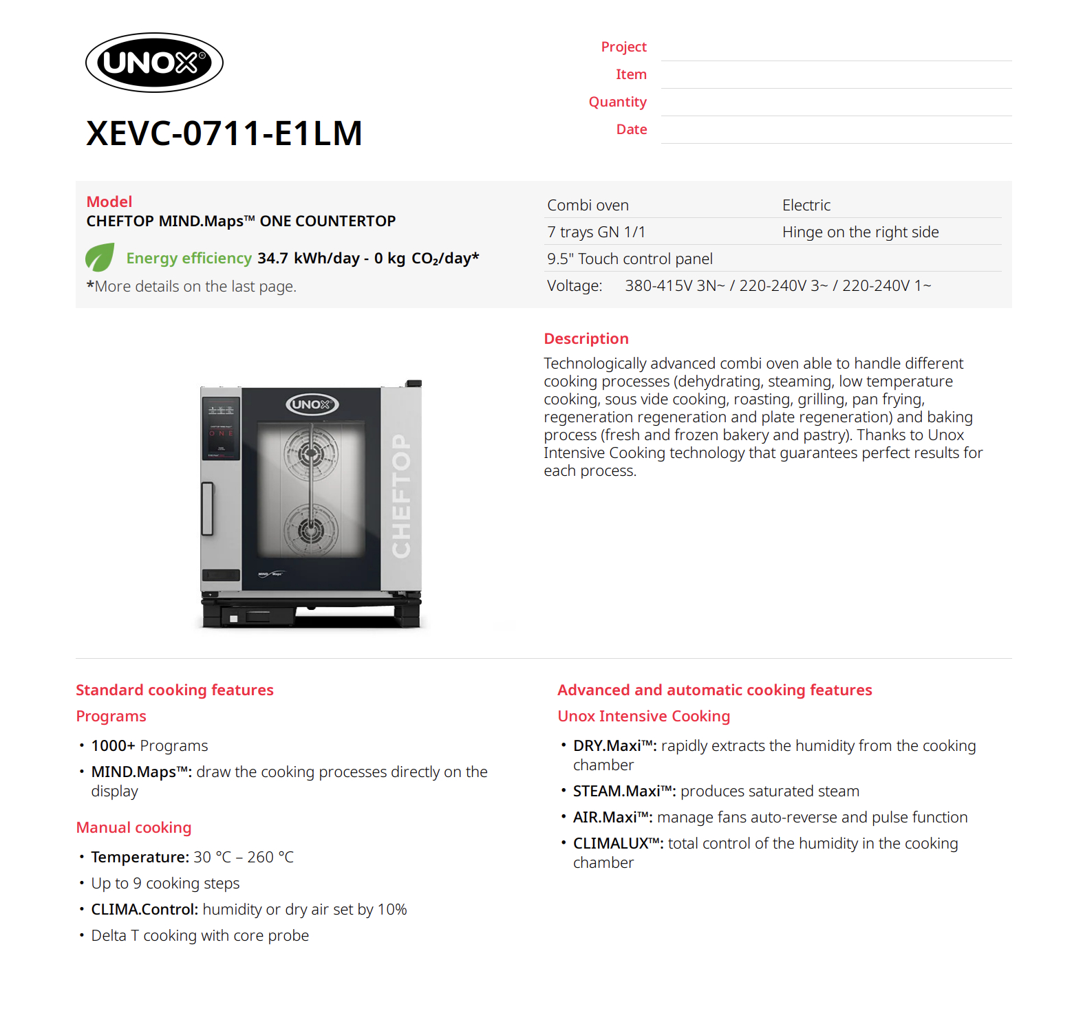 Пароконвекційна піч UNOX CHEFTOP MIND.Maps™ XEVC-0711-E1LM — це технологічний прорив у сфері професійного теплового обладнання, що втілює багаторічний досвід світового лідера галузі. Серія була створена спеціально для шеф-кухарів та рестораторів, які не готові до компромісів між творчою свободою та суворим контролем якості. Завдяки інтелектуальним системам управління, ця пічь гарантує абсолютну повторюваність результату: кожна страва буде ідеальною, незалежно від того, хто сьогодні стоїть на зміні.
