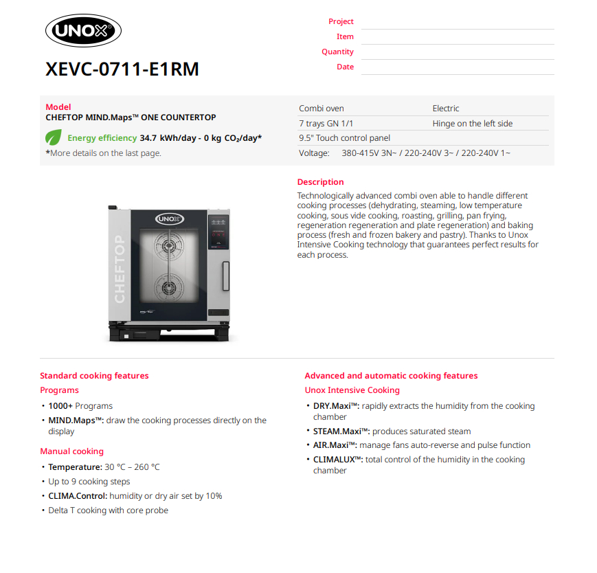 Пароконвекційна піч UNOX CHEFTOP MIND.Maps™ XEVC-0711-E1RM — це технологічний прорив у сфері професійного теплового обладнання, що втілює багаторічний досвід світового лідера галузі. Серія була створена спеціально для шеф-кухарів та рестораторів, які не готові до компромісів між творчою свободою та суворим контролем якості. Завдяки інтелектуальним системам управління, ця пічь гарантує абсолютну повторюваність результату: кожна страва буде ідеальною, незалежно від того, хто сьогодні стоїть на зміні.