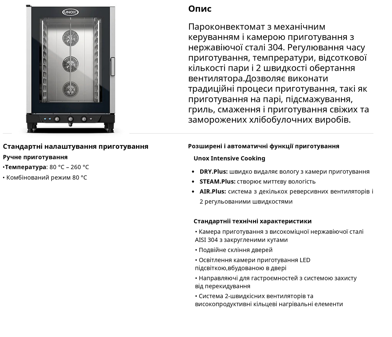Пароконвектомати Unox — професійне італійське обладнання для ресторанів, пекарень і закладів громадського харчування. Технології Unox забезпечують точний контроль температури та вологості, рівномірне приготування страв і стабільну якість результату. Надійний пароконвектомат Unox підходить для інтенсивної роботи кухні, допомагаючи оптимізувати процеси та підвищити продуктивність.