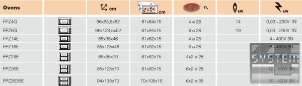 В линейке представлены как одно- (Z1) так и двухкамерные (Z2) модели, в которых может разместится 4 или 6 пицц диаметром 28 см. (соотв., 4G / 4E – для 4 пицц, 6G / 6E - для 6 пицц).