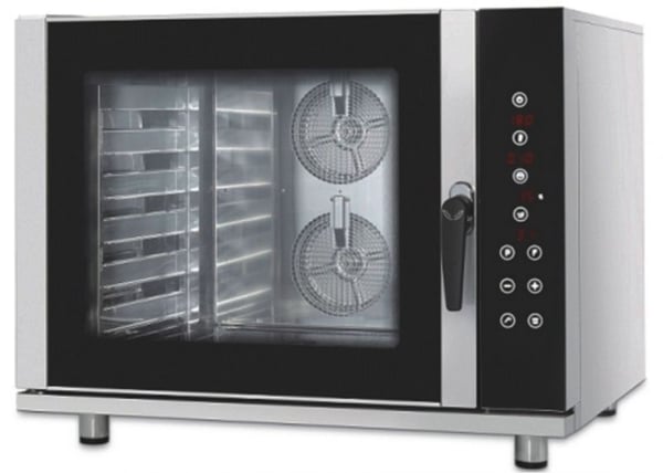 Конвекційна піч служить для приготування продуктів за допомогою рівномірної циркуляції гарячого повітря по всій поверхні печі. Циркуляція відбувається з допомогою роботи вентилятора. Конструкція печі виконана з нержавіючої сталі, скляні дверцята. Конструкція печі має заокруглені кути та знімні напрямні для кращого очищення, що дуже важливо для дотримання гігієни та чистоти. Управління піччю здійснюється за допомогою електромеханічної панелі. Додаткові функції: подача пари, регулювання обертів вентилятора, регулювання температури, таймер.