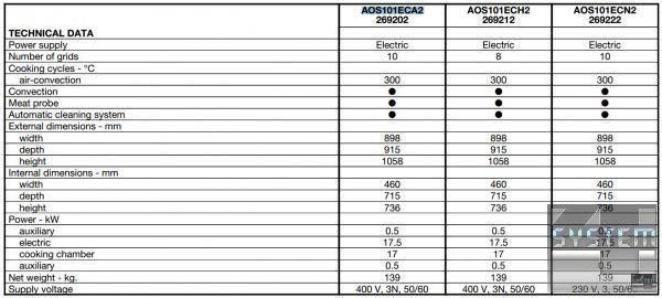 Конвекційна піч Electrolux AOS101ECA2 (артикул 269202) інжекторного типу на 10 GN1/1 гастроємностей, інжекторного типу, режим приготування задається вручну (виставляється температура, час приготування та рівень вологості в камері), автоматична система миття Air-o-Clean рівномірний розподіл гарячого повітря Air-o-Flow, 11 ступенів паронасичення, електронне управління, швидке охолодження камери, ручне упорскування води, функція марміту (так само дозволяє готувати при низьких температурах), однозонний пробник-зонд, подвійний склопакет дверей, термостат, підсвічування камери нерж. сталь. Плита має прямокутну конструкцію з габаритними розмірами: 898мм (довжина), 915мм (глибина), 1058мм (висота) та важить 139кг. Апарат живиться від трифазної мережі з напругою 400В та частотою 50 Гц.