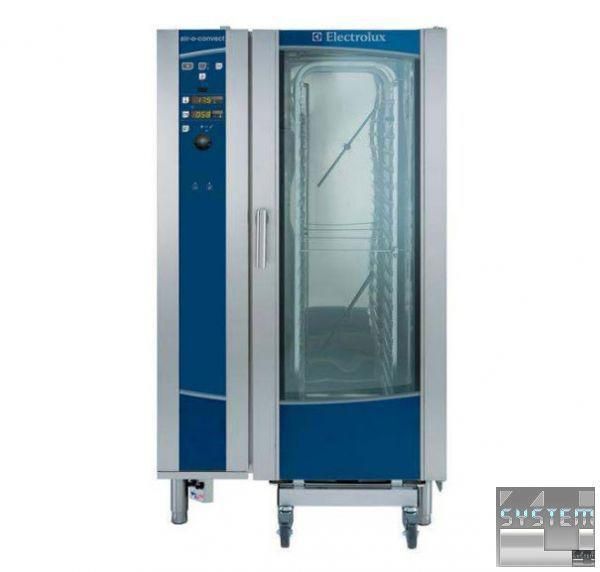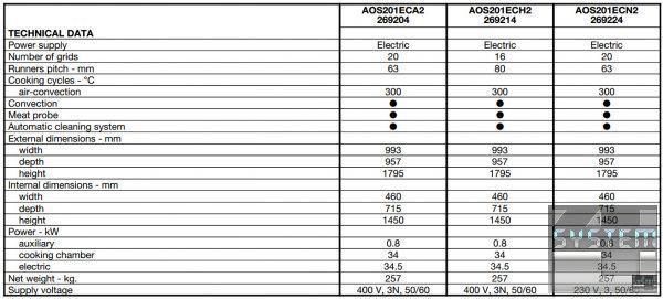 Конвекційна піч Electrolux AOS201ECA2 (артикул 269204) інжекторного типу на 20 GN1/1 гастроємностей, інжекторного типу, режим приготування задається вручну (виставляється температура, час приготування та рівень вологості в камері), автоматична система миття Air-o-Clean розподіл гарячого повітря Air-o-Flow, 11 ступенів паронасичення, електронне управління, швидке охолодження камери, ручне упорскування води, функція марміту (так само дозволяє готувати при низьких температурах), однозонний пробник-зонд, подвійний склопакет дверей, термостат, підсвічування камери, у комплекті з візком, нерж. сталь. Плита має високу прямокутну конструкцію з габаритними розмірами: 993мм (довжина), 957мм (глибина), 17957мм (висота) та важить 257кг. Апарат живиться від трифазної мережі з напругою 400В та частотою 50 Гц.