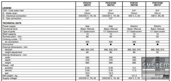 Конвекційна піч Electrolux FCE101 (артикул 260706) на 10 гастроємностей GN1/1 (поперечного розташування), 6 режимів приготування: (задається температура, час приготування та рівень вологості в камері), відстеження температури всередині камери, 5 ступенів паронасичення, швидке керування, подвійний склопакет двері, термостат, підсвічування камери, нерж. сталь AISI 304. Плита (Ovens) має габаритні розміри: 890мм (довжина), 900мм (глибина), 970мм (висота) та важить 121кг. Апарат живиться від трифазної мережі з напругою 400В та частотою 50 Гц.
