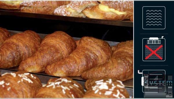 Потоки гарячого повітря завдяки особливим високошвидкісним і потужнішим вентиляторам рівномірно розподіляються в пекарній камері, забезпечуючи рівномірне пропікання продукту на всіх деках, що містяться в печі, і в кожній точці одного дека.