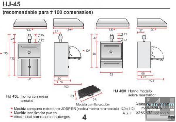 Пекти-гриль на закритому столі з дверцятами, з шафою над пічкою, з підставкою для деко та витяжним парасолькою з вентилятором, дозволяє одночасно використовувати переваги печі та мангалу. Як паливо використовується чисте деревне вугілля. Приготування їжі здійснюється у закритій печі на ґратах. Допускається одночасне використання не більше 2-х грат. Пекти HJX-45/LC*ACX-P підійде для обслуговування ресторану з 70 посадочними місцями. Виготовлена методом високоточного чавунного лиття (товщина стінки 5 см). Конструкція печі-грилю гарантує експлуатацію протягом 15-20 років без спеціального обслуговування. Для регулювання інтенсивності горіння служать шибер, стандартно встановлений на димарі печі і регульований колосник, розташований під ґратами, де відбувається згоряння вугілля. При установці в закритих приміщеннях конструкція печі гарантує її безпечну експлуатацію. Литі напрямні під ґрати дозволяють регулювати положення продукту щодо вугілля. Завдяки високим температурам час приготування страв у печі JOSPER дуже мало: - курячі ноги 3 хв. (7 кг, 2 грати); - Великі шматки яловичини 6 хв. (7 кг 2 грати); - Картопля цілком 10 хв. Служить для приготування всіх видів грилів та барбекю.