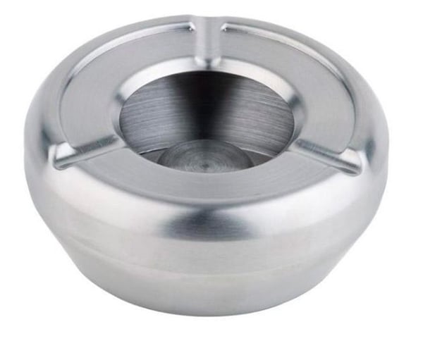 Попільничка з нержавійки виконана в формі кола, по окантовці передбачені спеціальні виїмки під сигарети.