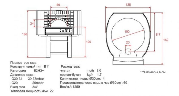 Нагрівання печі циклатермічний за допомогою газового пальника (метан/пропан-бутан), а так само ірециркулюючого вентилятора, який підтримує оптимальну температуру підлоги печі.