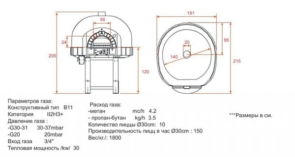 Нагрівання печі циклатермічний за допомогою газового пальника (метан/пропан-бутан), а так само ірециркулюючого вентилятора, який підтримує оптимальну температуру підлоги печі.