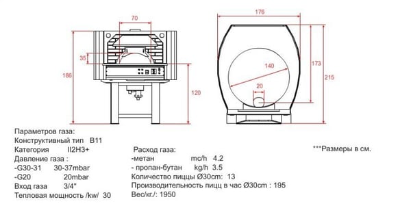 Нагрівання печі циклатермічний за допомогою газового пальника (метан/пропан-бутан), а так само ірециркулюючого вентилятора, який підтримує оптимальну температуру підлоги печі.