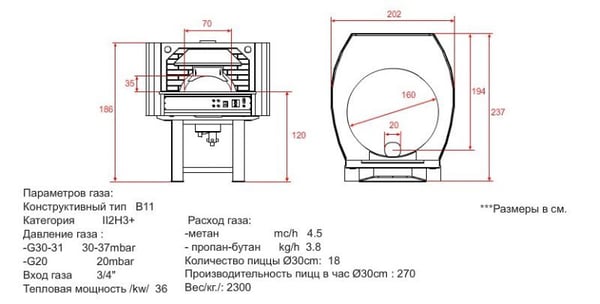 Нагрівання печі циклатермічний за допомогою газового пальника (метан/пропан-бутан), а так само ірециркулюючого вентилятора, який підтримує оптимальну температуру підлоги печі.