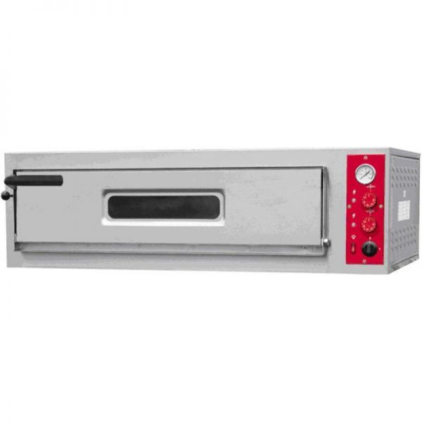 Пекти для піци однокамерна з електромеханічним керуванням має передню панель з нержавіючої сталі, корпус - з фарбованої сталі. Внутрішній розмір камери – 990х660х150мм. Місткість печі – 6 піц діаметром 300мм. Потужність верхніх Тенов – 2х2000Вт, нижніх – 2х1670Вт. Камера має регулювання температури до +450С. Дно камери викладено вогнетривким каменем. Піч оснащена внутрішнім підсвічуванням, жароміцним оглядовим вікном у дверцятах, термометром.