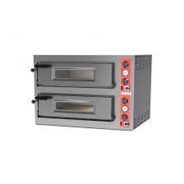 Пекти для піци двокамерна з електромеханічним керуванням має передню панель з нержавіючої сталі, корпус - з фарбованої сталі. Внутрішній розмір кожної камери – 990х660х150мм. Місткість печі – 2х6 піци діаметром 300мм. Потужність верхніх тенів – 4х2000Вт, нижніх – 4х1670Вт. Кожна камера має незалежне регулювання температури до +450С. Дно камер викладено вогнетривким каменем. Піч оснащена внутрішнім підсвічуванням, жароміцним оглядовим вікном у дверцятах, термометром.