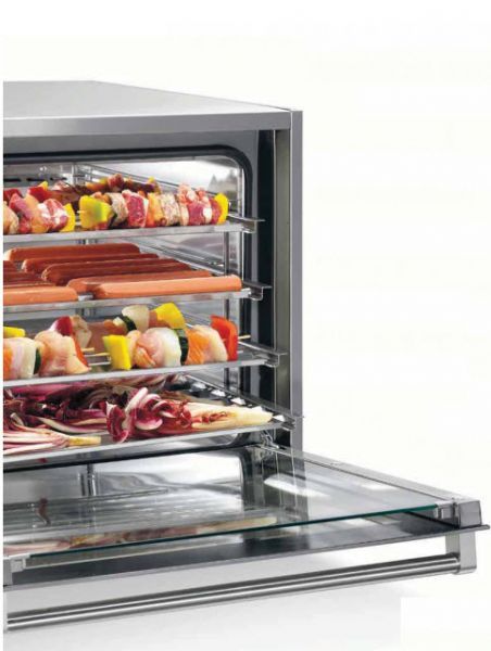 Існує функція швидкого охолодження печі. Дверцята печі виконані з магнітом по всьому периметру для щільного закриття і з великим подвійним склом. У комплектації грати з напрямними, які легко знімаються.
