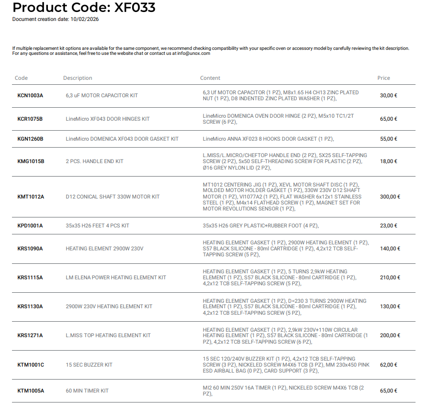 Рекомендований список деталей Unox XF033