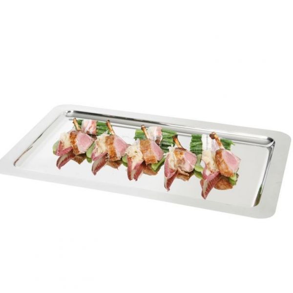 Таця для банкетів, виконана з нержавіючої сталі. Відполірований, має матовий обідок, краї заокруглені.