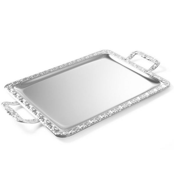 Таця з ручками, виконана з нержавіючої сталі. Відполірований, має декоративний обідок, краї заокруглені.