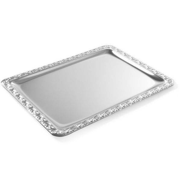 Таця з декоративним обідком, виконана з нержавіючої сталі. Відполірований, краї заокруглені.