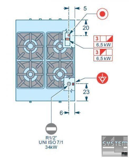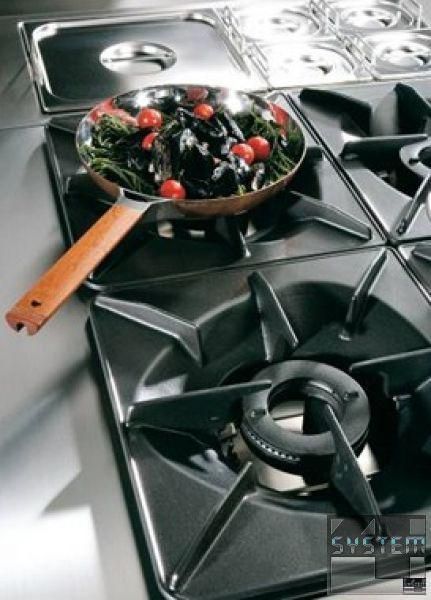 Открытые горелки имеют двойную корону огня, две из них мощностью 7 кВт (диаметр 110 мм) и две - 10 кВт (диаметр 130 мм).