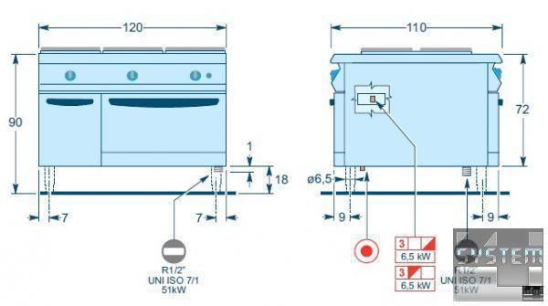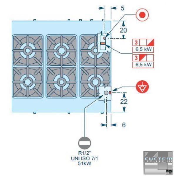 Газовая плита на 6 горелок Angelo Po 12WFAAE на электрической статической печи и нейтральном отделении относится к тепловой модульной линии OMEGA 1100.