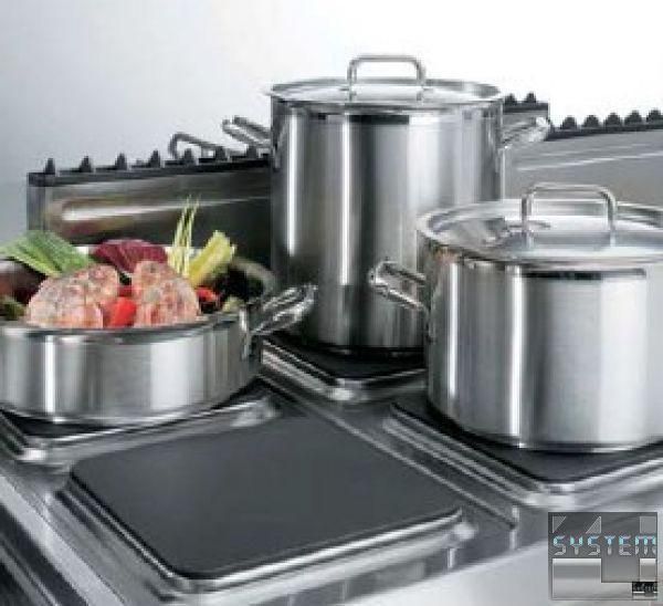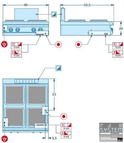 Плиты оборудованы электрическими конфорками мощностью 4 кВт каждая, квадратной формы (295 х 295 мм), сделанными из чугуна, с термостатом безопасности.