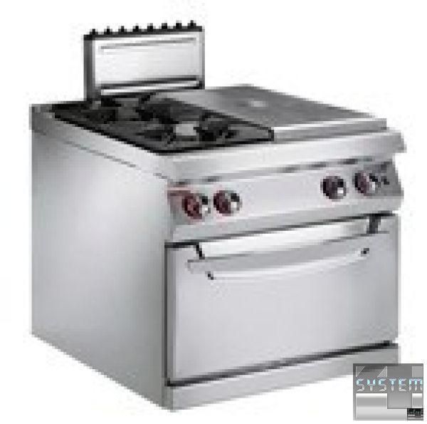 Висота верхніх решіток оптимальна для достатнього припливу повітря до пальників, навіть при використанні великих каструль. Компонується газовою духовкою 7,5 кВт. Три рівні для гастроємностей з нержавіючої сталі, легко знімаються для очищення. У комплекті хромовані решітки 1х 2/1 GN. Контролер температури приготування від 80 до 300°C.
