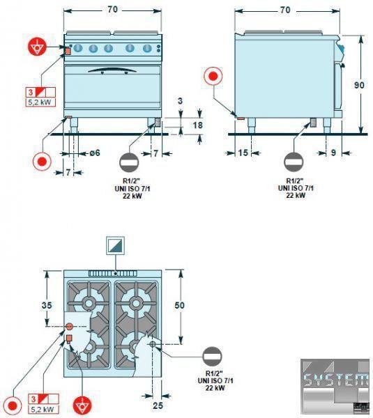 Духовые шкафы изготавливаются из полированной нержавеющей стали AISI 430. Они комплектуются тремя направляющими для гастроемкостей, которые могут устанавливаться в трех разных положениях. Данная плита оснащена конвекционной печью вместимостью 3 х 1/1 GN.
