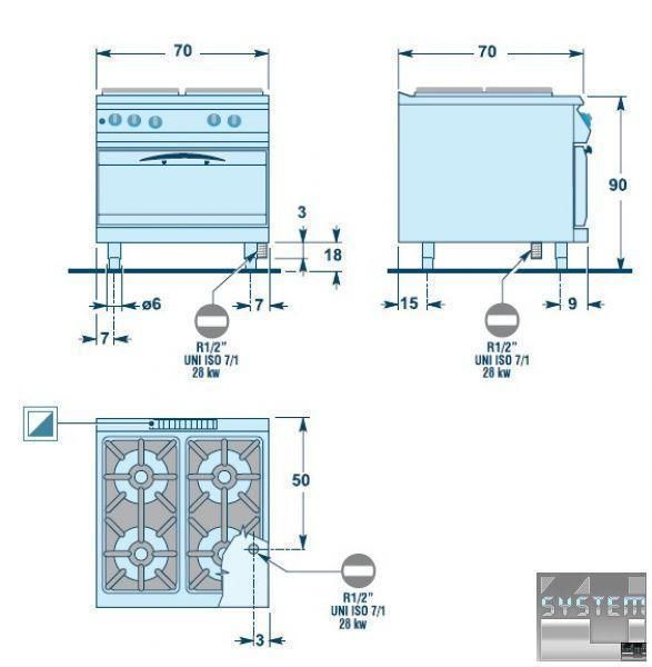 Духовые шкафы изготавливаются из полированной нержавеющей стали AISI 430. Они комплектуются тремя направляющими для гастроемкостей, которые могут устанавливаться в трех разных положениях. Данная плита оснащена статической печью вместимостью 1 x 2/1 GN.