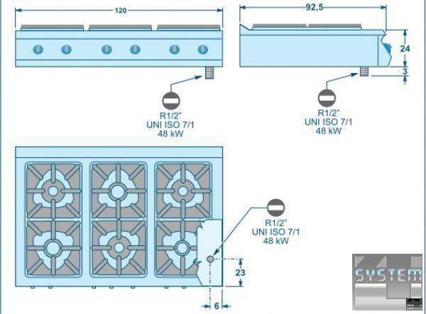 Плита газовая, открытая, настольная на 6 горелок, общей мощностью 48 кВт: одна горелка на 4 кВт на (диаметр 80 мм, однорядное пламя), 2 горелки по 7 кВт (диаметр 110 мм, с "двойной короной") и 3 горелки по 10 кВт ( диаметр 130 мм, с "двойной короной" ), без духового шкафа - функциональный элемент линии Alpha 900. Горелки водонепроницаемы и прессформированы. Термостатический клапан с пилотом, термопарой и пьезоэлектрическим воспламенением. Перед покупкой необходимо уточнить тип газа для конкретного экземпляра плиты. Подставка поставляется отдельно. Материал корпуса – нержавеющая сталь AISI 304 толщиной 2 мм, горелки из чугуна, благодаря чему достигнута безпрецендентная прочность и жесткость всей конструкции, обеспечивающая долговечность эксплуатации. Возможность компоновки с газовой или электрической статистической духовкой, снабженной новой безотказной электронной системой зажигания, мощной теплоизоляцией. Внутренний размер позволяет использовать стандартные емкости и решетки форматом GN2/1. Духовка полностью из нержавеющей стали AISI 430 со съемными направляющими. Три положения противня по высоте духовки.