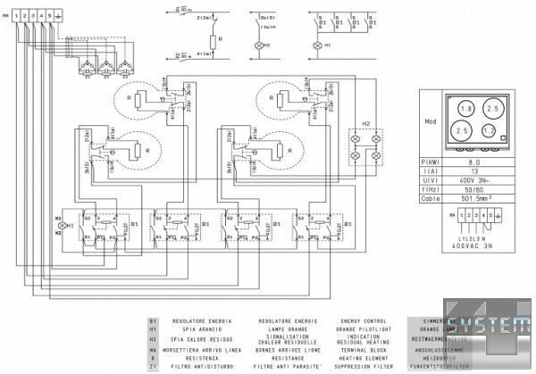 4 рабочие зоны - 2 х 2,5 кВт,220 мм, 1 х 1,8 кВт,180 мм, 1 х 1,2 кВт,145 мм