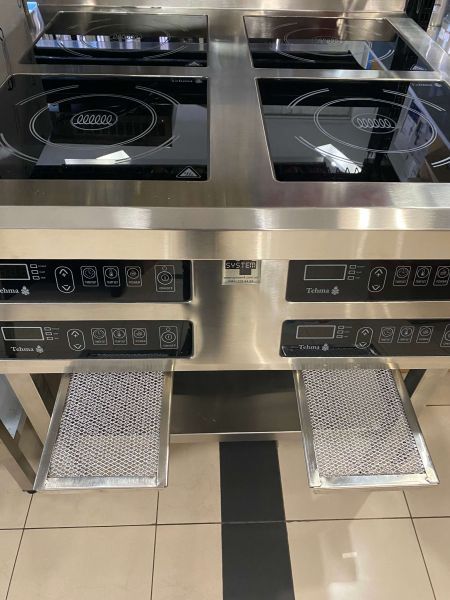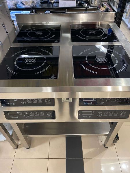 Індукційна плита для підлоги на 4х3,5 кВт для професійної кухні кафе, ресторану та їдальні, оснащена енергозберігаючою конфоркою і великим зручним у повсякденній роботі кухаря сенсорним пультом, який виключає "затікання" і поломку кнопки.