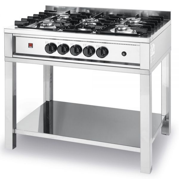 Професійна газова плита як нижній модуль - йде без духової шафи і оснащена відкритим модулем, який можна використовувати для зберігання сковорідок або каструль.