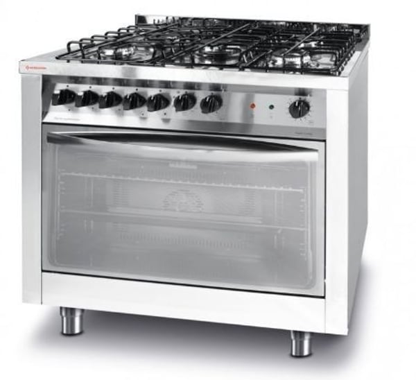 Професійна газова плита Революшин, як нижній модуль, оснащена електричним конвекційним шафою для смаження і грилем .