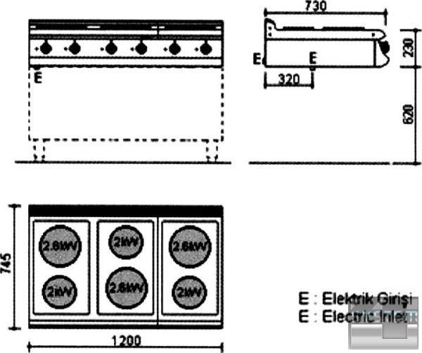 3 конфорки: Ø180 мм - 2 кВт.