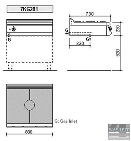 Зовнішні панелі із сатинованого хромонікелевого листа 18/8 н/с. Тверда поверхня завдовжки 20 мм. Усі газові прилади відповідають міжнародним стандартам. Може бути використаний СНД чи природний газ, і перетворення відбувається без будь-якої модифікації. Газовий вентиль з розточувальним смолоскипом, мінімальне/максимальне полум'я і у разі згасання полум'я він автоматично припиняє подачу газу. Газові пальники однакової працездатності для різного типу газу, кожен пальник оснащений розточувальним пристроєм та термореле. З шафою (з дверима чи без) придатна для багатофункціонального використання або на консолі для встановлення ізольованого типу.