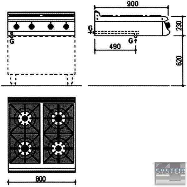Зовнішні панелі із сатинованого хромонікелевого листа 18/8 н/с. Емальована з чавунним покриттям надпотужного типу. Усі газові прилади відповідають міжнародним стандартам. Може використовуватися як СНД, і природний газ і перетворення відбувається без будь-якої модифікації. Газові втулки з факелом. Мінімально-максимальне полум'я та у разі припинення горіння, подача газу припиняється автоматично. Газові пальники мають однакову працездатність для будь-якого типу газу, кожен пальник оснащений запобіжним клапаном та термоелементом. також під пальниками є емальовані піддони для збирання олії. Придатна для розташування з шафою (з дверима або без) для багатофункціонального використання або консолі для установок ізольованого типу.