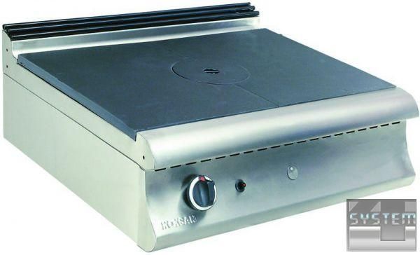 Зовнішні панелі із сатинованого хромонікелевого листа 18/8 н/с. Суцільна поверхня завтовшки 20 мм. Усі газові прилади відповідають міжнародним стандартам. Може використовуватися як СНД, так і природний газ, і перетворення відбувається без будь-якої модифікації, газові втулки з факелом, мінімально-максимальне полум'я і в разі припинення горіння, подача газу припиняється автоматично. Газові пальники мають однакову працездатність для будь-якого типу газу, кожен пальник оснащений запобіжним клапаном і термоелементом, також під пальниками є емальовані піддони для збирання олії. Придатна для розташування із шафою (з дверима або без) для багатофункціонального використання або на консолі для установок ізольованого типу.