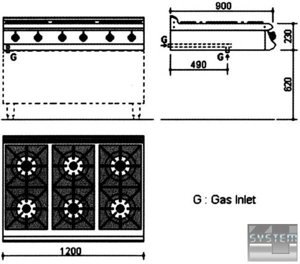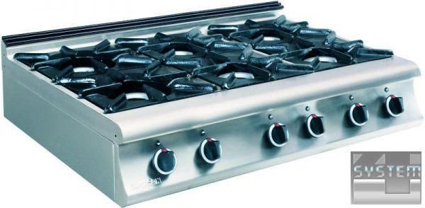 Зовнішні панелі із сатинованого хромонікелевого листа 18/8 н/с. Емальована з чавунним покриттям надпотужного типу. Усі газові прилади відповідають міжнародним стандартам. Може використовуватися як СНД, і природний газ і перетворення відбувається без будь-якої модифікації. Газові втулки з факелом. Мінімально-максимальне полум'я та у разі припинення горіння, подача газу припиняється автоматично. Газові пальники мають однакову працездатність для будь-якого типу газу, кожен пальник оснащений запобіжним клапаном та термоелементом. також під пальниками є емальовані піддони для збирання олії. Придатна для розташування з шафою (з дверима або без) для багатофункціонального використання або консолі для установок ізольованого типу.